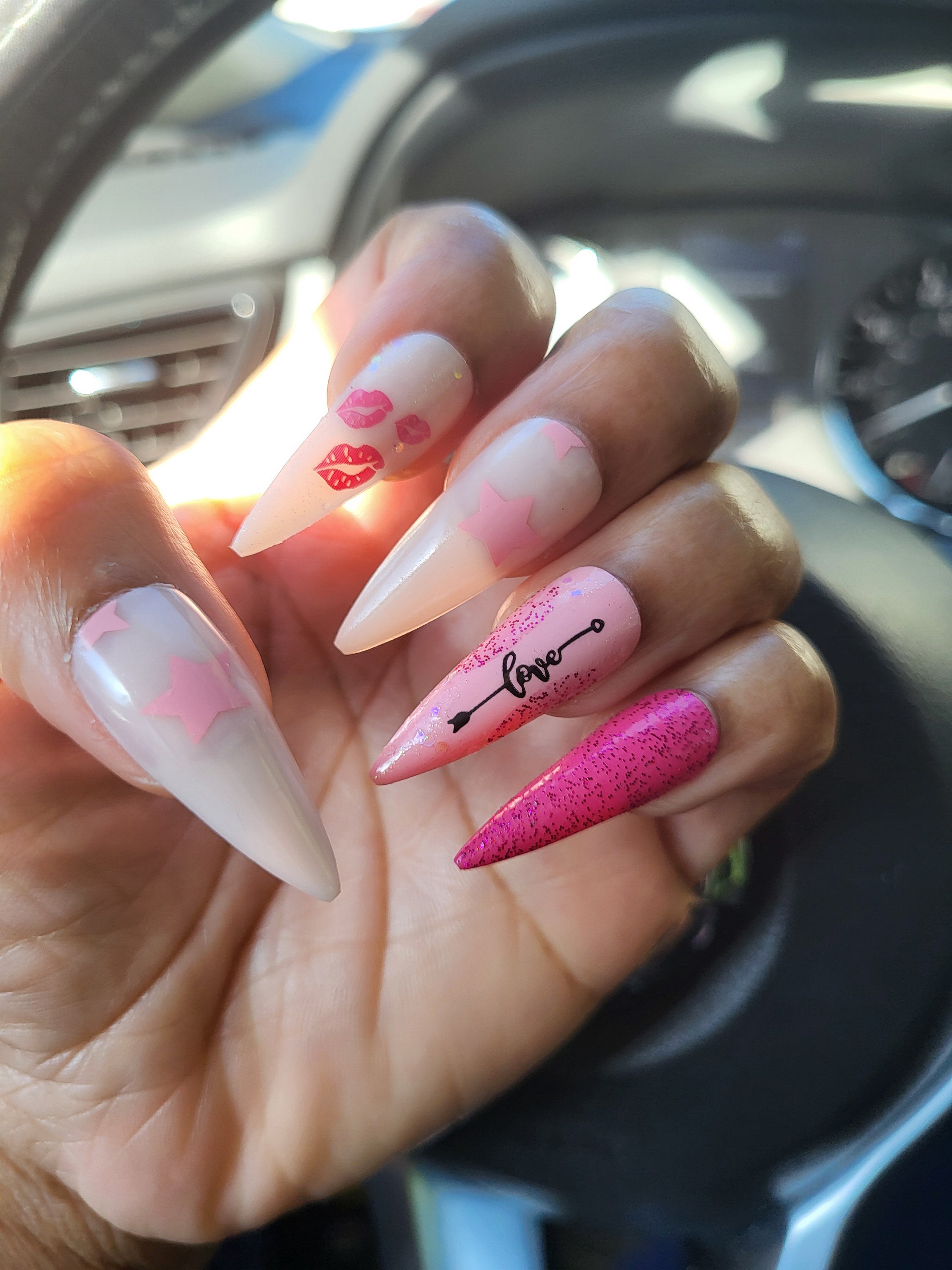 Custom Gel Press on Nails Medium Square Pink w/Hearts Nail Set-Size Medium-RTS ,